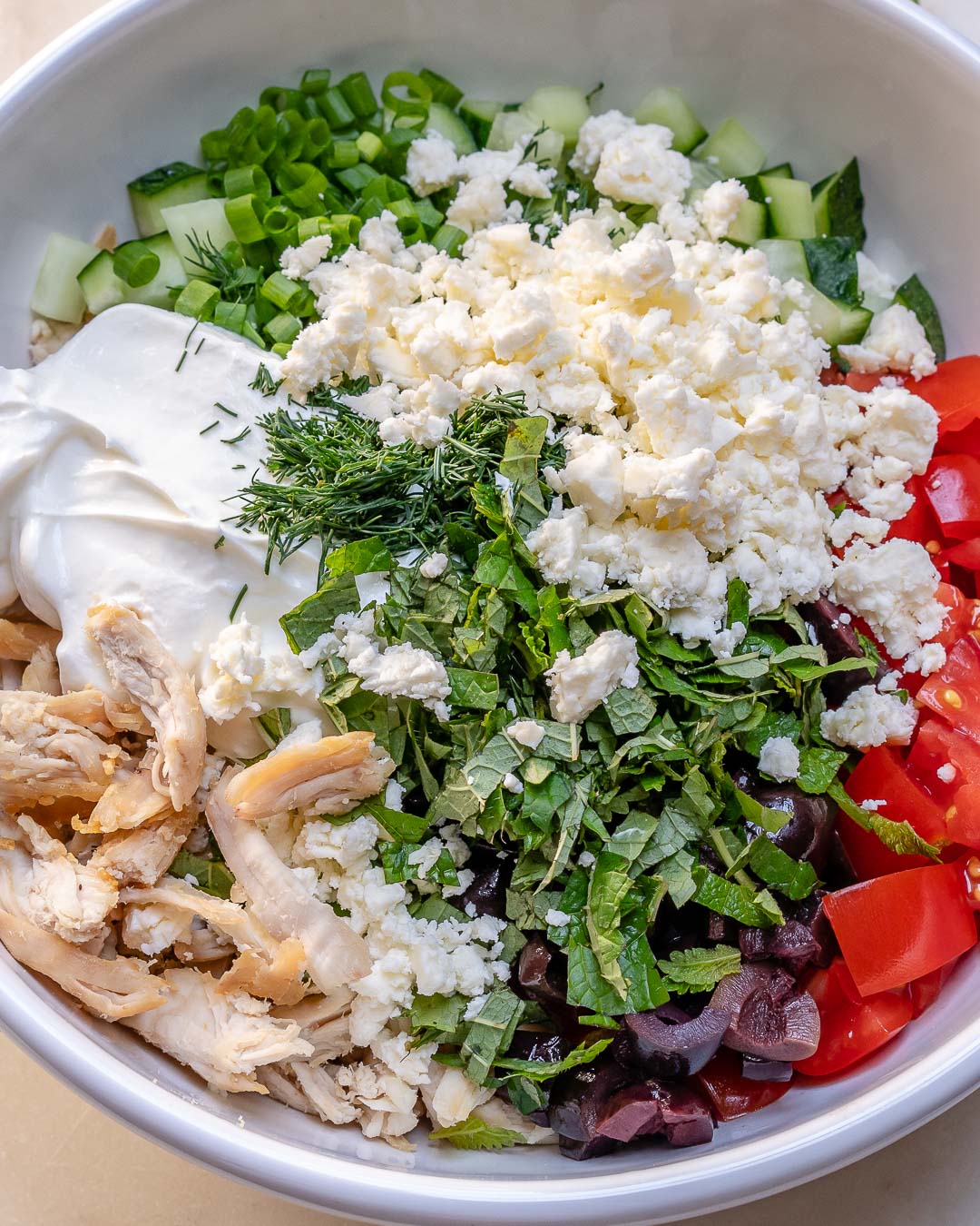 - In a medium bowl, combine shredded chicken, tomatoes, cucumber, olives, onions, cheese, garlic, lemon juice and zest, mint, dill, oregano, and yogurt.